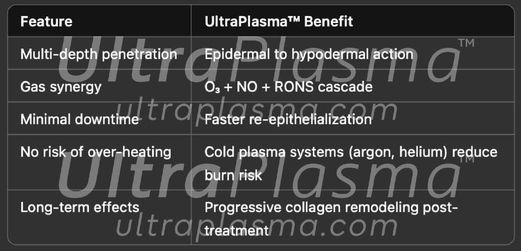 UltraPlasma™ is a state-of-the-art multi-platform plasma system that synergizes arc plasma, argon plasma, and helium plasma technologies for comprehensive anti-aging treatment. These modalities target different layers of the skin (epidermis, dermis, hypodermis) and elicit regenerative processes through the interaction of therapeutic gases such as ozone (O₃), nitric oxide (NO), and reactive oxygen/nitrogen species (RONS). This article details the mechanism of action, therapeutic targets, and clinical efficacy of UltraPlasma™ in reversing signs of aging including wrinkles, loss of elasticity, dermal thinning, and pigmentation disorders.