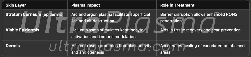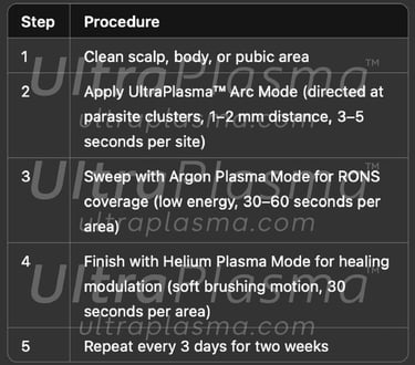 Pediculosis, caused by Pediculus humanus capitis (head lice), Pediculus humanus corporis (body lice), and Phthirus pubis (pubic lice), remains a widespread public health issue globally. Traditional chemical treatments have faced challenges due to increasing resistance and skin toxicity. UltraPlasma™ multi-platform plasma systems — integrating arc plasma, argon plasma, and helium plasma technologies — offer a novel, non-chemical approach to eradicate lice and their nits while promoting scalp and skin healing. Plasma-induced reactive oxygen and nitrogen species (RONS), including ozone (O₃), nitric oxide (NO), and singlet oxygen (¹O₂), play a pivotal role in parasitic destruction, inflammation modulation, and tissue regeneration. This article comprehensively reviews the mechanisms of action, skin layer interactions, and clinical implications of UltraPlasma™ treatment in pediculosis management.
